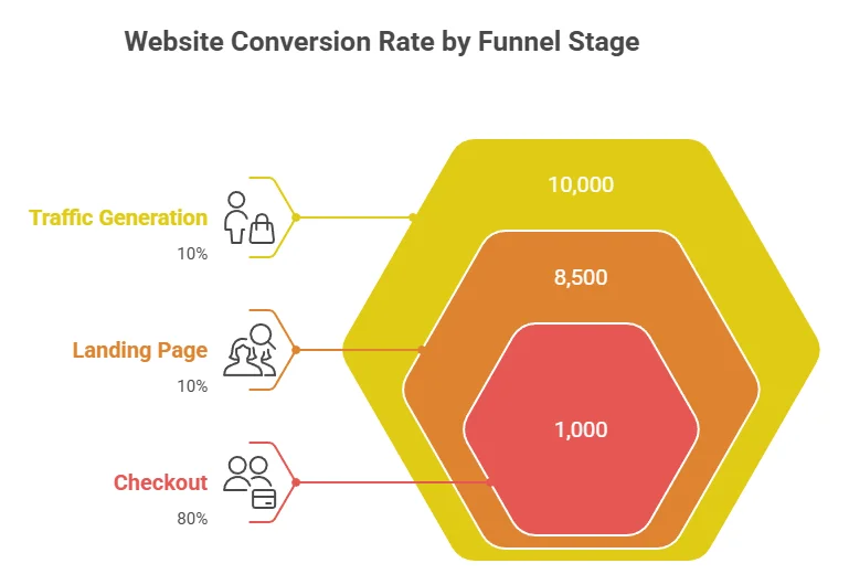 In the table above, you can see how conversion rates vary at different stages of the funnel. Traffic generation is the first touchpoint, where only 10% of visitors turn into potential leads. However, once they reach the landing page, that percentage stays the same, implying a possible lack of engaging content. But at checkout, a strong conversion rate of 80% indicates that your payment process is efficient.