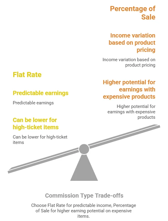 | Flat Rate | Predictable earnings | Can be lower for high-ticket items |