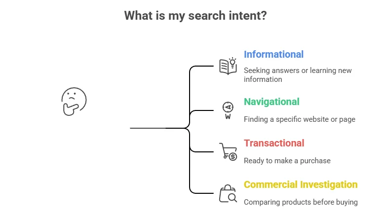 Search intent can be categorized into several types. Knowing these types equips you with the ability to choose keywords that will effectively connect with your target audience. Here are the main categories: